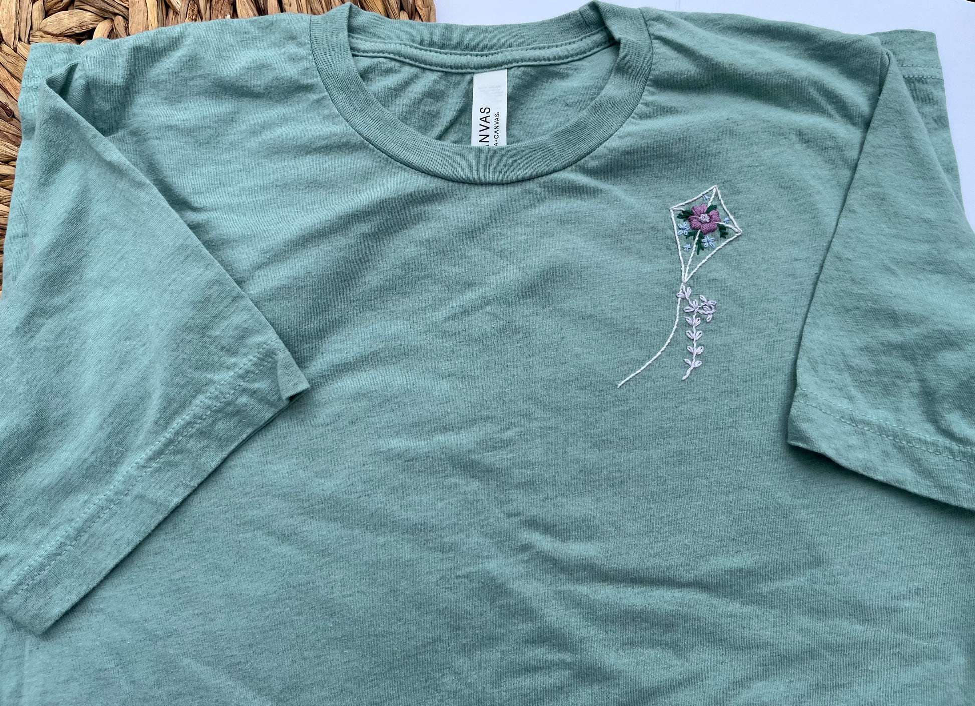 This hand embroidered shirt is a Bella + Canvas Mint heathered with a floral kite design.