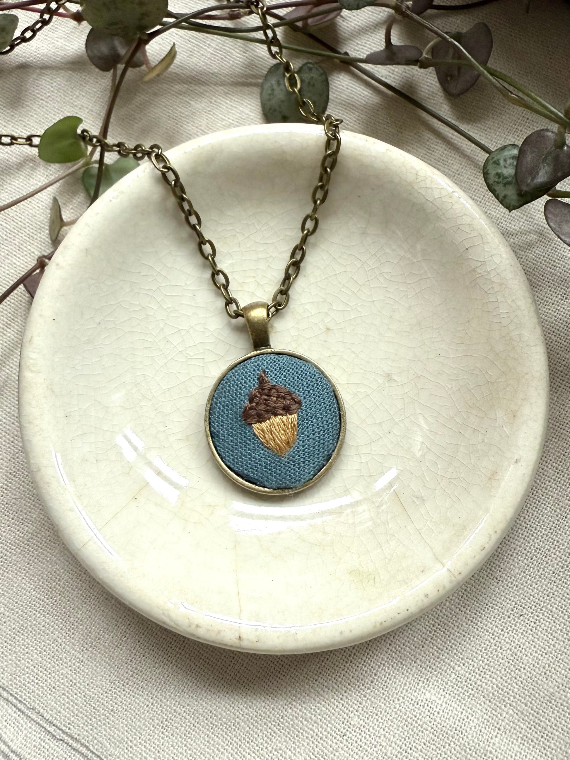 This necklace features a tiny acorn embroidered pendant on blue fabric.
