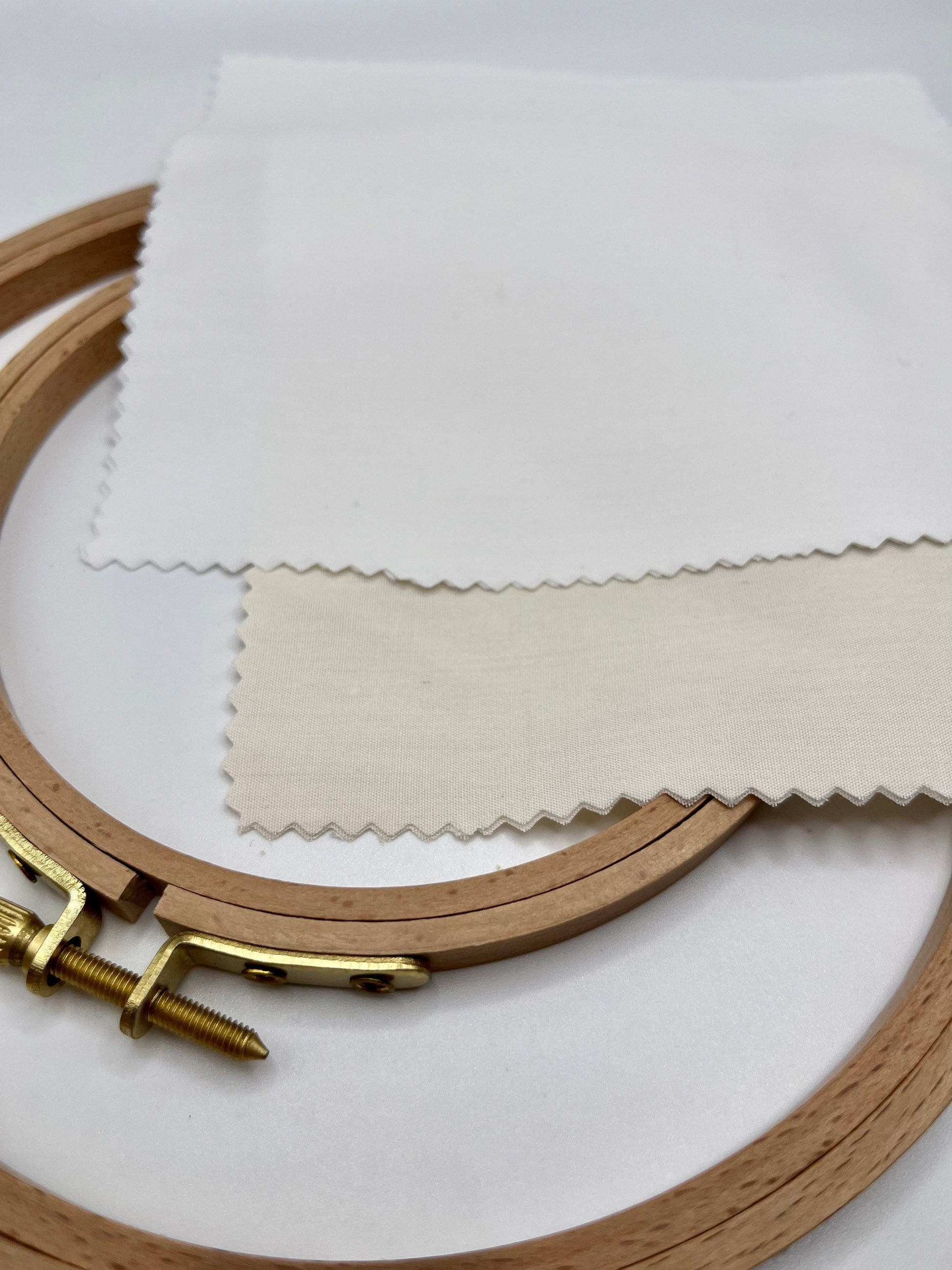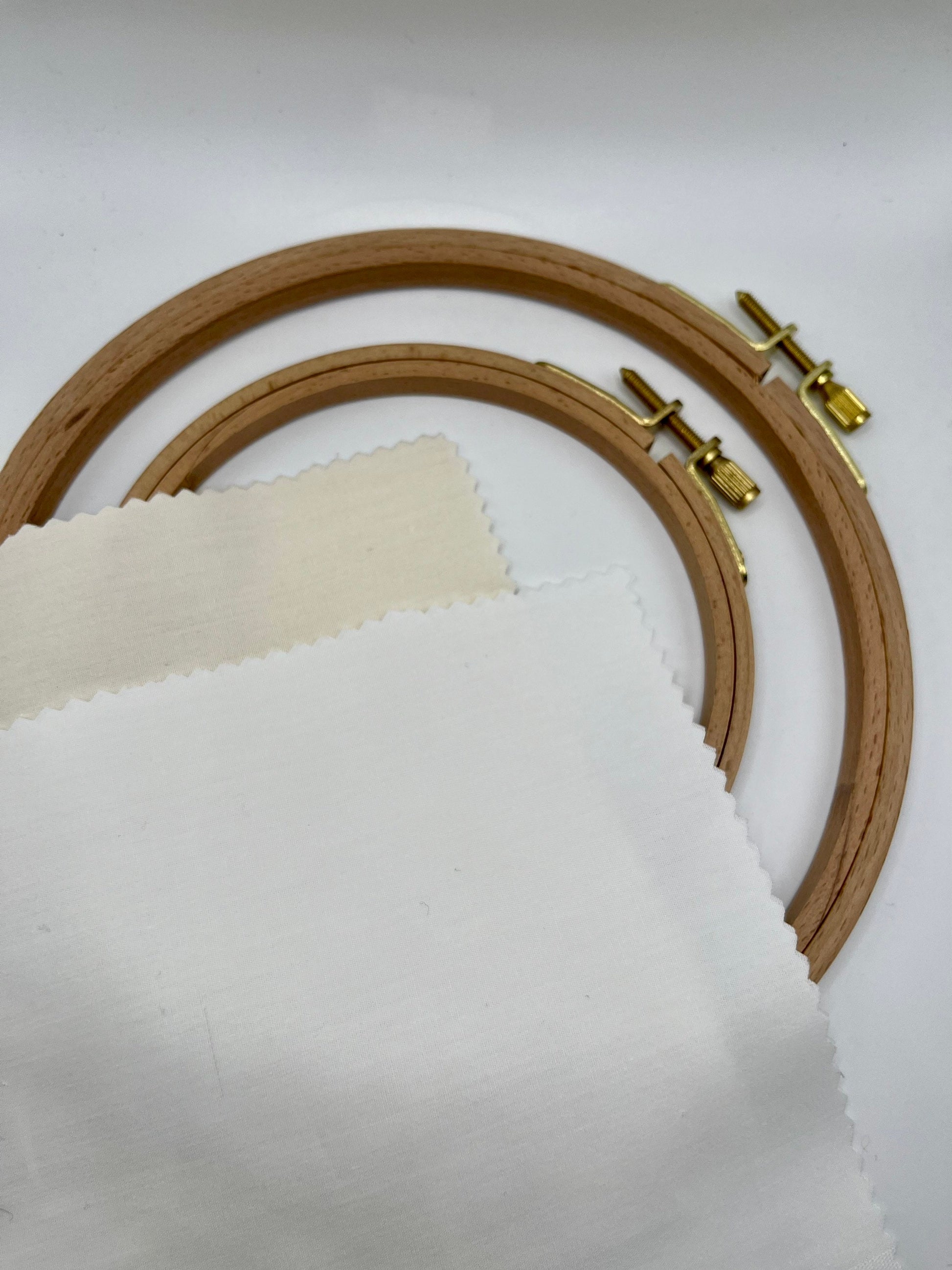 These are cut in approx. 8x8 inch squares which will fit best in 6” embroidery hoops. They’re trimmed with pinking shears to reduce fraying.
