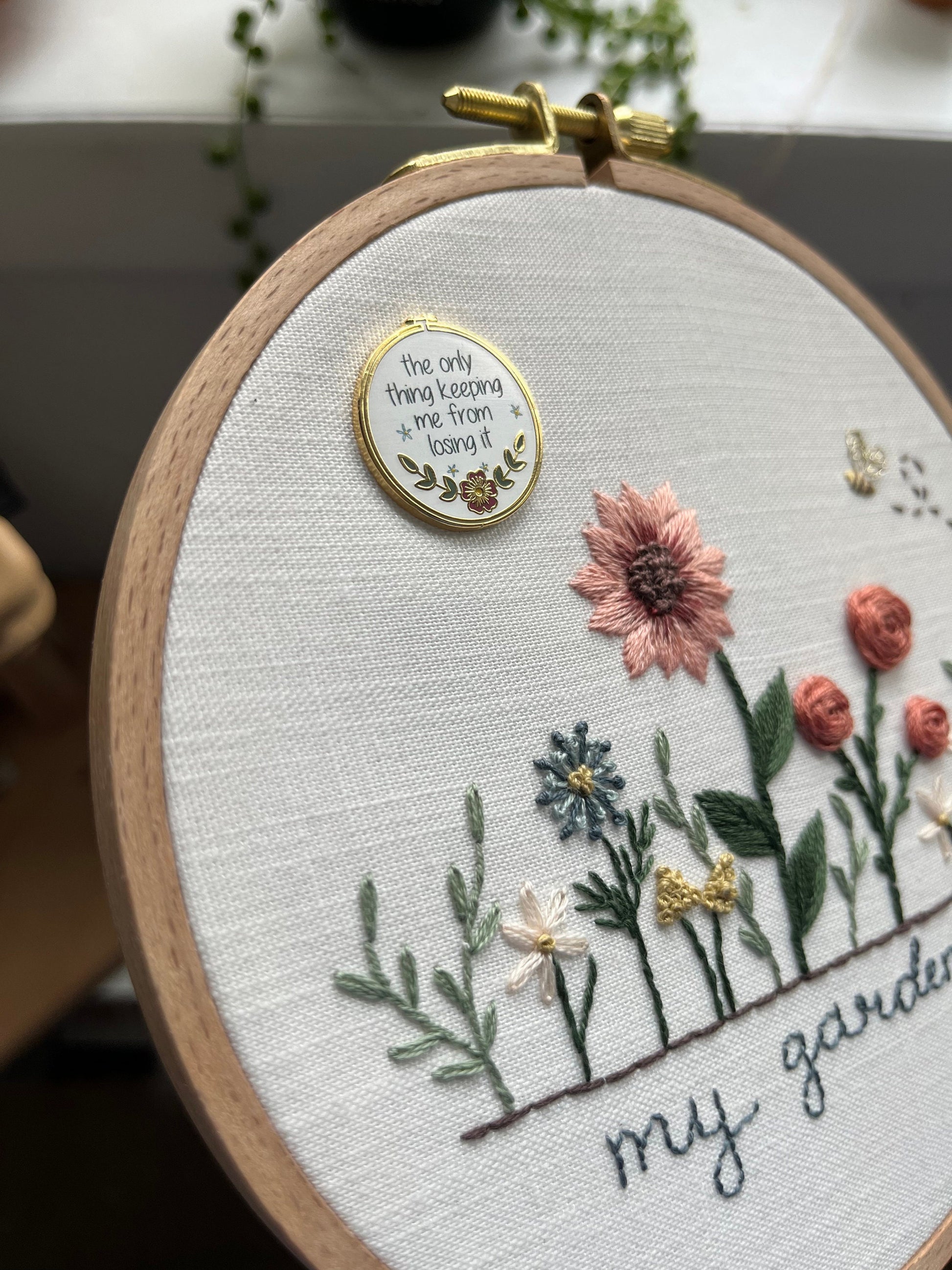This needle minder was designed by me. The size of a quarter with a magnetic back. It’s gold colored and shaped like an embroidery hoop with the phrase “the only thing keeping me from losing it”. Keep track of your needles while stitching by attaching this to your work and sticking the needle to the front.