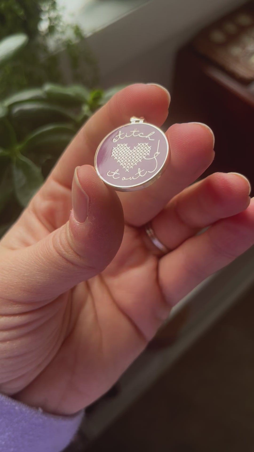This needle minder was designed by me. The size of a quarter with a magnetic back. It’s a beautiful rose gold color with the phrase “stitch it out” and a cross stitch heart on a plum background. Keep track of your needles while stitching by attaching this to your work and sticking the needle to the front.